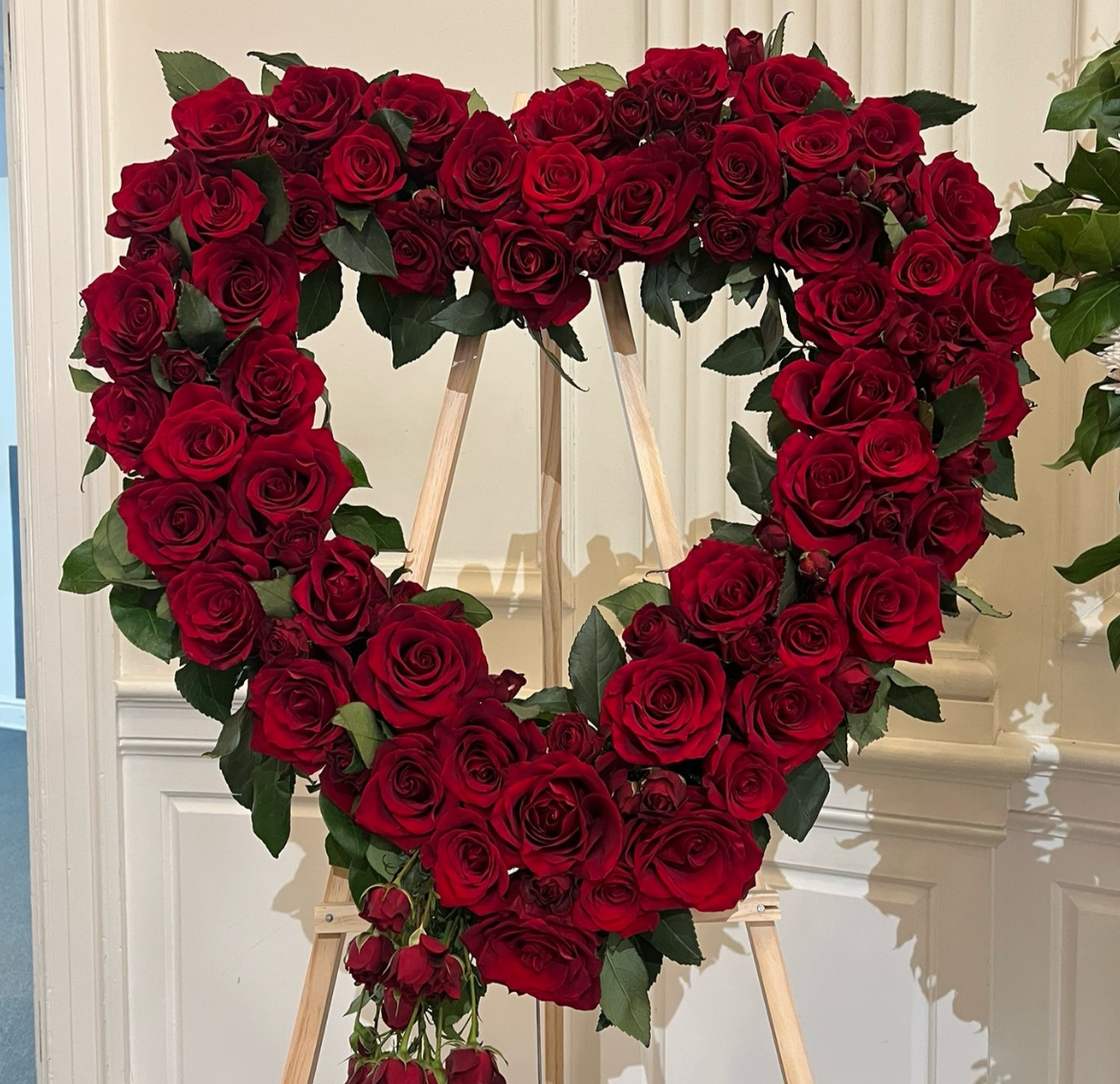 Heart-shaped arrangement of red roses and green foliage. quantity