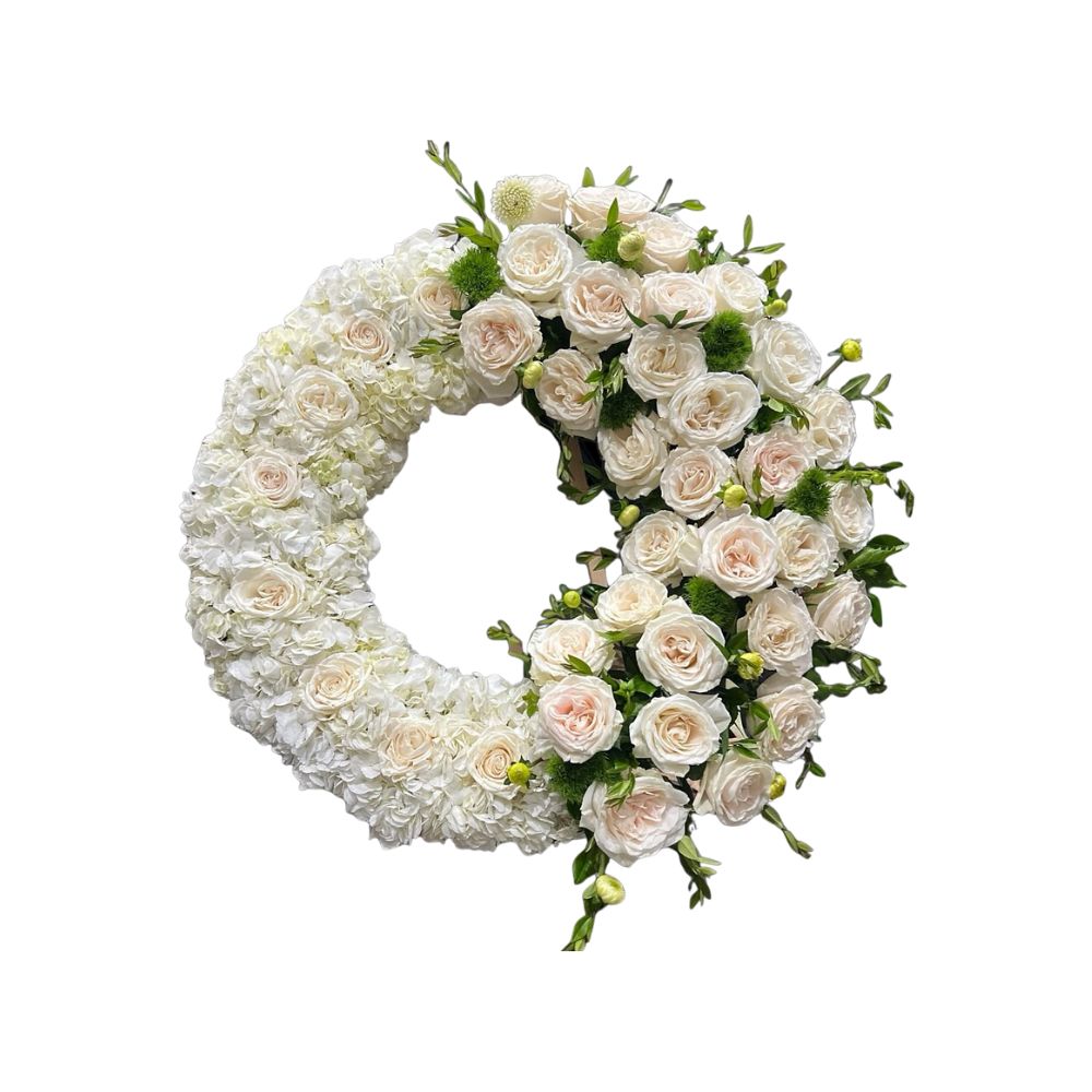 A wreath of white hydrangeas with blush roses and greenery.,A round wreath of white hydrangea blossoms adorned with a lush cascade of blush garden roses and greenery.