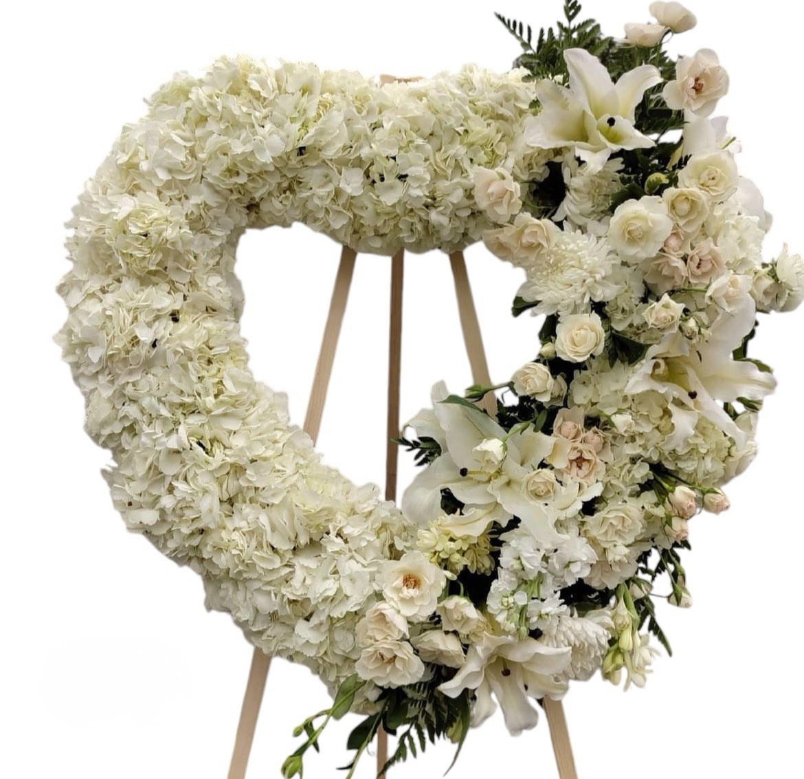 White Hydrangea Heart with Ivory Roses and Lily Accents